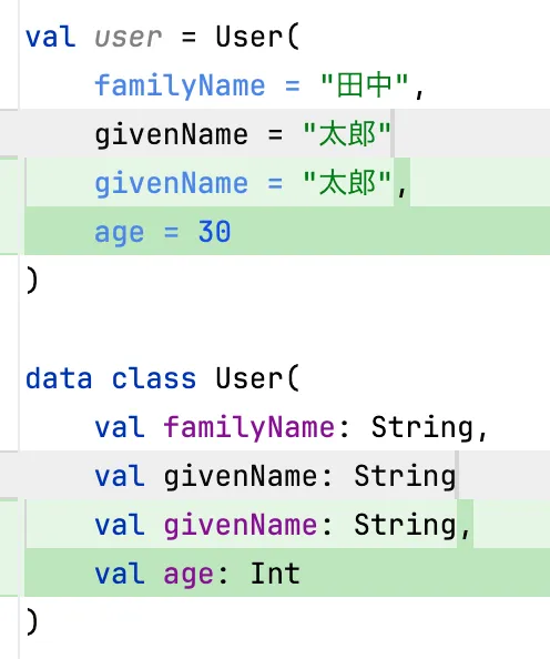 // 呼び出し側val user = User( familyName = "田中", givenName = "太郎", // trailing comma)Trailing commaの最大のメリットは、引数の追加、削除、入れ替えをした時のGitのdiffが見やすくなることだと思います。