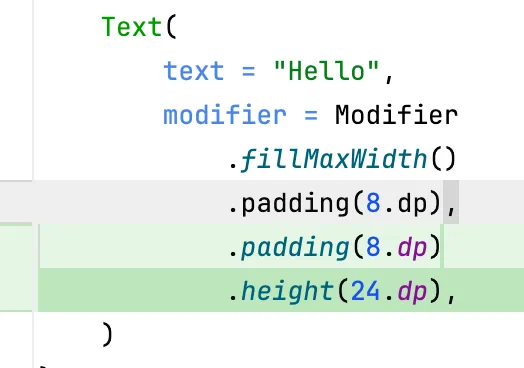 Text( text = "Hello", modifier = Modifier .fillMaxWidth() .padding(8.dp),)このModifierチェーンの末尾にheightを追加すると、diffは下記のようになります。paddingの後ろについていたカンマがなくなるため、余計な差分が出てしまいます。記事の最初で紹介したtrailing commaをつけない場合のデメリットと同じことが、trailing commaがあることによって生じてしまっています。
